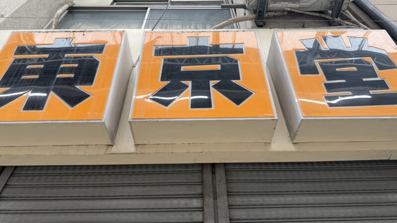 3月27日 「東京堂」の看板。オレンジ背景に黒い堂々としたフォントがかわいい。好き。
