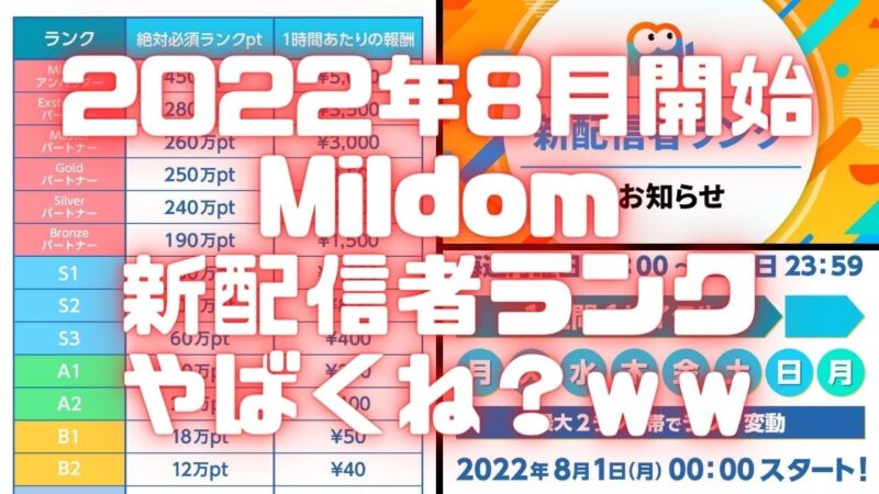ミルダムが今後オワコンになるか考えました。 配信者ランクが大幅変更されます。 2022年8月1日から時給1円…