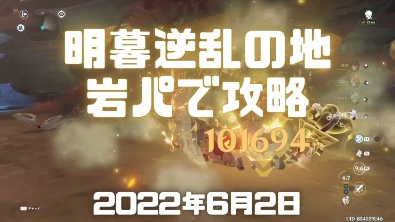 原神を配信で実況しました。 「明暮逆乱の地(めいぼぎゃくらんのち?)」を攻略しました。 岩パ2回使って…