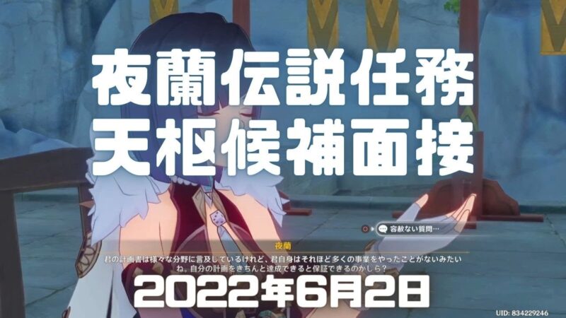 原神を配信で実況しました。 夜蘭の伝説任務「先の布石(幽客の章 第一幕・七星選抜)」が開始しました。 天…