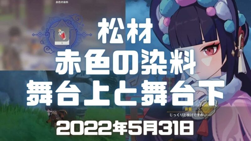 原神を配信で実況しました。 松材の場所と赤色の染料の場所がこちらです。 「舞台上と舞台下」で雲菫が活…